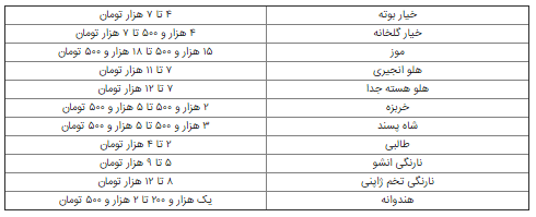 کارگر با اشاره به نرخ سایر میوهها در بازار بیان کرد: در حال حاضر هر کیلو خیار بوته با نرخ ۴ تا ۷ هزار تومان، خیار گلخانه ۴ هزار و ۵۰۰ تا ۷ هزار تومان، موز ۱۵ هزار و ۵۰۰ تا ۱۸ هزار و ۵۰۰ تومان، هلو انجیری ۷ تا ۱۱ هزار تومان، هلو هسته جدا ۷ تا ۱۲ هزار تومان، خربزه ۲ هزار و ۵۰۰ تا ۵ هزار و ۵۰۰ تومان، شاه پسند ۳ هزار و ۵۰۰ تا ۵ هزار و ۵۰۰ تومان، طالبی ۲ تا ۴ هزار تومان، نارنگی انشو ۵ تا ۹ هزار تومان و نارنگی تخم ژاپنی ۸ تا ۱۲ هزار تومان و هندوانه یک هزار و ۲۰۰ تا ۲ هزار و ۵۰۰ تومان در میدان مرکزی میوه و تره بار و با احتساب حداکثر ۳۵ درصد سود در خرده فروشیها عرضه میشود.