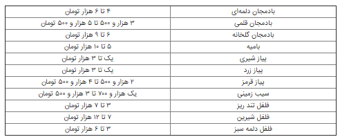 این مقام مسئول قیمت هر کیلو بادمجان دلمهای را ۴ تا ۶ هزار تومان اعلام کرد و گفت: قیمت هر کیلو بادمجان قلمی ۳ هزار و ۵۰۰ تا ۵ هزار و ۵۰۰ تومان، بادمجان گلخانه ۶ تا ۹ هزار تومان، بامیه ۵ تا ۱۰ هزار تومان، پیاز شیری یک تا ۳ هزار تومان، پیاز زرد یک تا ۳ هزار تومان، پیاز قرمز ۲ هزار و ۵۰۰ تا ۴ هزار و ۵۰۰ تومان، سیب زمینی یک هزار و ۷۰۰ تا ۳ هزار و ۵۰۰ تومان، فلفل تند ریز ۳ تا ۷ هزار تومان، فلفل شیرین ۷ تا ۱۲ هزار تومان و فلفل دلمه سبز ۳ تا ۶ هزار تومان است.