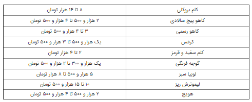 رئیس اتحادیه میوه و سبزی ادامه داد: در حال حاضر هر کیلو کلم بروکلی با نرخ ۸ تا ۱۴ هزار تومان، کاهو پیچ سالادی ۲ هزار و ۵۰۰ تا ۴ هزار و ۵۰۰ تومان، کاهو رسمی ۳ تا ۴ هزار و ۵۰۰ تومان، کرفس یک هزار و ۵۰۰ تا ۳ هزار و ۵۰۰ تومان، کلم سفید و قرمز ۲ تا ۴ هزار تومان، گوجه فرنگی یک هزار و ۳۰۰ تا ۲ هزار و ۵۰۰ تومان، لوبیا سبز ۵ هزار و ۵۰۰ تا ۸ هزار تومان، لیموترش ریز ۱۰ تا ۱۵ هزار و ۵۰۰ تومان و هویج ۲ هزار و ۵۰۰ تا ۴ هزار و ۵۰۰ تومان در میدان مرکزی میوه و تره بار و با احتساب حداکثر ۳۵ درصد سود در خرده فروشیها عرضه میشود.