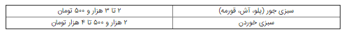این مقام مسئول نرخ هر کیلو سبزی جور (پلو، آش و قورمه) را ۲ تا ۳ هزار و ۵۰۰ تومان و سبزی خوردن را ۲ هزار و ۵۰۰ تا ۴ هزار تومان اعلام کرد.