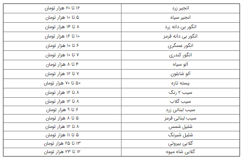 اسداله کارگر قیمت هر کیلو انجیر زرد را ۱۲ تا ۲۰ هزار تومان اعلام کرد و افزود: قیمت هر کیلو انجیر سیاه ۵ تا ۱۰ هزار تومان، انگور بی دانه زرد ۸ تا ۱۴ هزار تومان، انگور بی دانه قرمز ۱۰ تا ۱۶ هزار تومان، انگور عسگری ۶ تا ۱۰ هزار تومان، انگور کندری ۷ تا ۱۰ هزار تومان، آلو سیاه ۴ تا ۸ هزار تومان، آلو شابلون ۷ تا ۱۲ هزار تومان، پسته تازه ۵۰ تا ۷۰ هزار تومان، سیب ۲ رنگ ۸ تا ۱۲ هزار تومان، سیب گلاب ۸ تا ۱۲ هزار تومان، سیب لبنانی زرد ۶ تا ۹ هزار تومان، سیب لبنانی قرمز ۵ تا ۸ هزار تومان، شلیل شمس ۸ تا ۱۲ هزار تومان، شلیل شبرنگ ۵ تا ۱۱ هزار تومان، گلابی بیروتی ۱۳ تا ۲۵ هزار تومان و گلابی شاه میوه ۱۲ تا ۲۳ هزار تومان است.