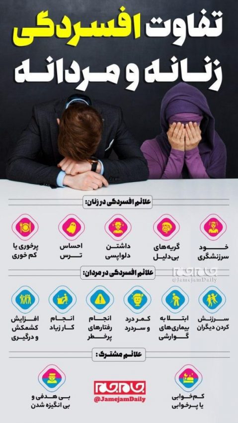 خانه / اجتماعی / تفاوت افسردگی زنانه و مردانه چیست؟/ اینفوگرافی تفاوت افسردگی زنانه و مردانه چیست؟/ اینفوگرافی تیم تحریریه ۲۹ مهر ۱۳۹۹ اجتماعی پرخوری، احساس ترس و خودسرزنشی ویژگی های افسردگی در زنان است. در مقابل، مردها بیشتر به سرزنش دیگران پرداخته و به کار زیاد میپردازند. بررسی این محتوا با هوش مصنوعی مطالب مرتبط “مجسمه ایستادگی ملت ایران” در پارکینگ: مجسمهای که به فرجام نرسید (+عکس)تهران در محاصره آلودگی: هوای ناسالم برای همه تا یکشنبه۹۷ درصد ذخیره آب در سد کرج خالی شد برچسبها: افسردگیزنانه
