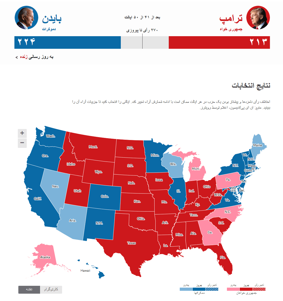 خانه / بین الملل / نتایج شمارش اراء انتخابات آمریکا (بروز می شود) نتایج شمارش اراء انتخابات آمریکا (بروز می شود) تیم تحریریه ۱۴ آبان ۱۳۹۹ بین الملل انتخابات آمریکا- نتایج اولیه شمارش آراء در برخی از ایالت های آمریکا به شرح زیر میباشد: بررسی این محتوا با هوش مصنوعی مطالب مرتبط ادعای میدل ایست: ترکیه راه حل توافق نفتی ایران و آمریکامحمد مهاجری: اغتشاشگران اصلی در خیابان نبودند ؛ در مجلس و تلویزیون و شوراها و … دنبال شان باشیدواکنش تند ایران به مصوبه اروپا: محکومیت شدید و هشدار برچسبها: انتخابات 2020انتخابات امریکابایدنترامپجو بایدندونالد ترامپشمارش آراءنتیجه انتخابات امریکا