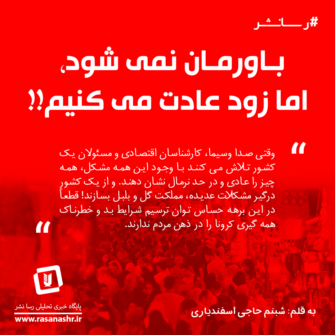 وقتی صدا وسیما، کارشناسان اقتصادی و مسئولان یک کشور تلاش می کنند با وجود این همه مشکل، همه چیز را عادی و در حد نرمال نشان دهند. و از یک کشور درگیر مشکلات عدیده، مملکت گل و بلبل بسازند! قطعاً در این برهه حساس توان ترسیم شرایط بد و خطرناک همه گیری کرونا را در ذهن مردم ندارند.