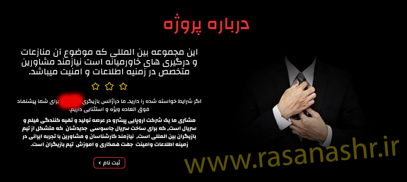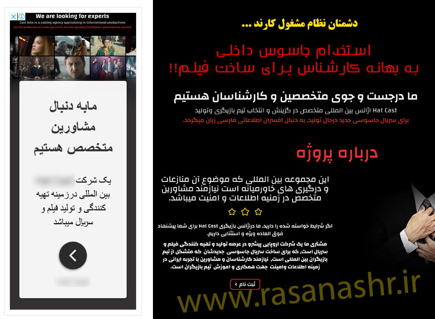 یک آگهی تبلیغاتی در پلتفرم تبلیغاتی گوگل (ادسنز) به زبان فارسی که از متخصصین و کارشناسان برای حضور درساخت یک فیلم دعوت می کند . طبق اطلاعات ارائه شده موضوع این فیلم منازعات و درگیری های خاورمیانه بوده و از نوع جاسوسی می باشد. در این آگهی از فارسی زبانان کارشناس و با تجربه در زمینه اطلاعات و امنیت جهت همکاری و آموزش تیم بازیگران دعوت بعمل آورده است. وب سایت مد نظر خود را یک شرکت خدمات تولید و بازیگری فیلم معرفی نموده و سازنده فیلم را یک شرکت بین المللی اروپایی که کارش ساخت فیلم و سریال است معرفی می کند.