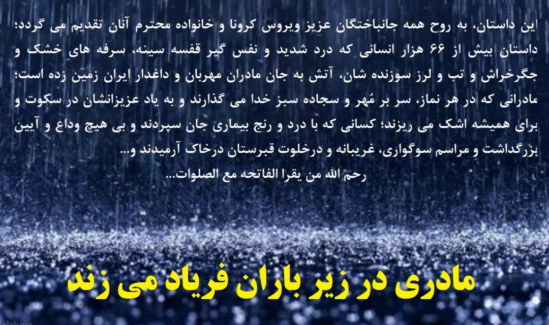 چند لحظه بعد، در بارش شدید باران بهاری، درد شدید و نفس گیر قفسه سینه، سرفه های خشک و جگرخراش و تب و لرز سوزنده بیش از ۶۶ هزار انسان و بغض مانده در گلوی مادر، ناگهان به شیون و فریادی بلند و دردناک تبدیل می شود؛ فریادی جانسوز که تمام فضای سرد قبرستان را به لرزه در می آورد و آتش به جان مادران مهربان و داغدار ایران زمین می زند؛ مادرانی که در هر نماز، سر بر مُهر و سجاده سبز خدا می گذارند و به یاد عزیزانشان در سکوت و برای همیشه اشک می ریزند؛ کسانی که با درد و رنج بیماری جان سپردند و بی هیچ وداع و آیین بزرگداشت و مراسم سوگواری، غریبانه و درخلوت قبرستان درخاک آرمیدند و… رحم الله من یقرا الفاتحه مع الصلوات…