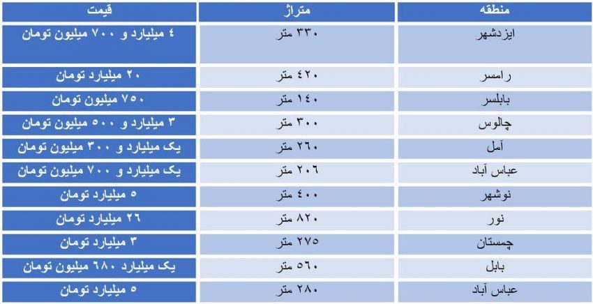 قیمت روز برخی از ویلاهای مناطق شمالی در جدول زیر آمده است: