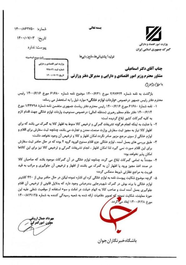 در پی درخواست تعدادی از شرکت های داخلی تولید لوازم خانگی از رهبر معظم انقلاب برای جلوگیری از واردات لوازم خانگی، رئیس دفتر رئیس جمهور خطاب به وزرای اقتصاد و صمت دستور جلوگیری از واردات لوازم خانگی از دو کشور کره را مکتوب کرد.