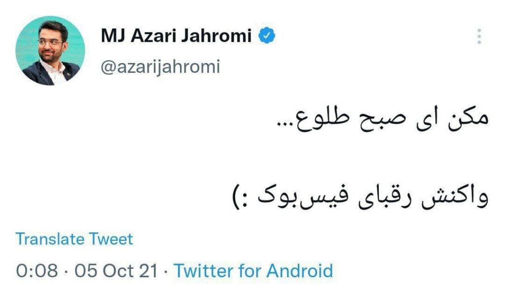 آذری جهرمی وزیر سابق ارتباط با انتشار توییت زیر به اختلال فیس بوک و پیام رسان هایش واکنش نشان داد.