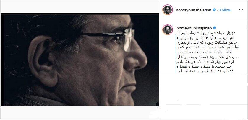 او در این پست اینستاگرامی نوشت: «عزیزان، خواهشمندم به شایعات توجه نفرمایید و به آنها دامن نزنید. پدر به خاطر مشکلات ریوی که ناشی از بیماری قبلیشون هست و در دو هفته اخیر کمی ادامهدار شده است، تحت مراقبت و رسیدگیهای ویژه هستند و وضعیتشان از دیروز بهتر شده است. خواهشمندم خبر صحیح را فقط و فقط و فقط و فقط و فقط از طریق صفحه اینجانب دنبال کنید. دوم اسفند ۹۸/ ساعت ۲۳:۲۷»