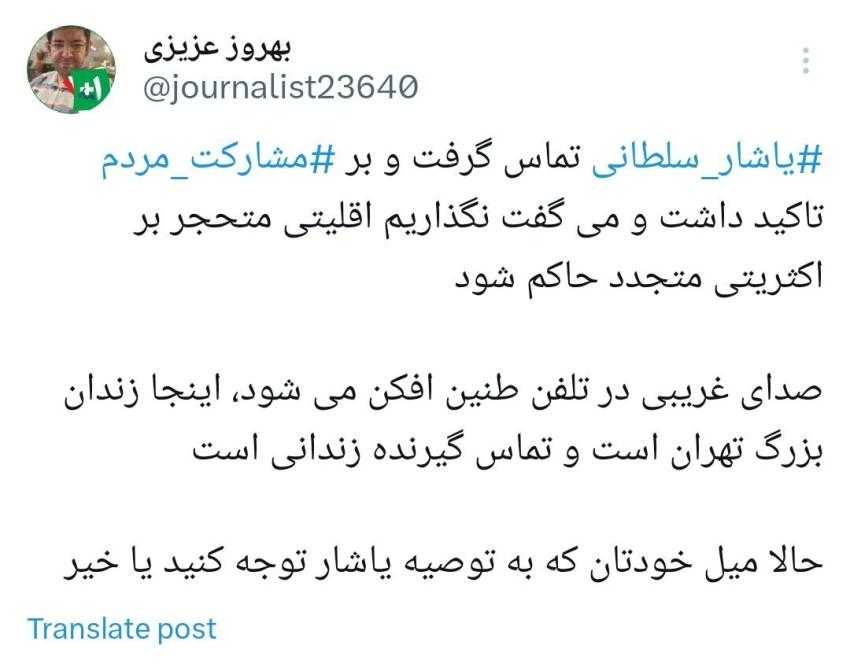خانه / سیاسی / پیام یاشار سلطانی از داخل زندان پیام یاشار سلطانی از داخل زندان تیم تحریریه ۱۴ تیر ۱۴۰۳ سیاسی بهروز عزیزی، از دوستان یاشار سلطانی، تماس تلفنی او از زندان را این گونه روایت کرده است. بررسی این محتوا با هوش مصنوعی مطالب مرتبط آمریکا بابک زنجانی را هم تحریم کرد؛ فرماندهان سپاه در لیستعراقچی: مذاکره با ایران در سایه تهدید آمریکا ممکن نیستدستگیری پزشکان در اعتراضات اخیر: سازمان نظام پزشکی پیگیر است برچسبها: افشاگریزندانمشارکتیاشار سلطانی