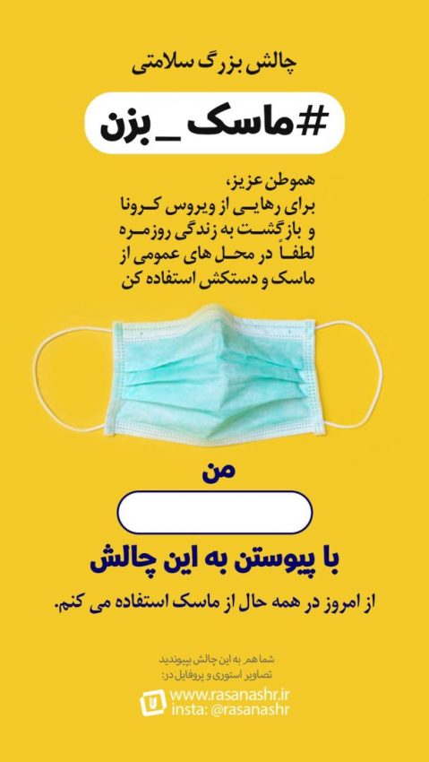 ما کار زیادی نمیخوایم انجام بدین. اول اینکه بمدت چند روز تصویر پروفایلتون رو با تصویر چالش عضو کنید. و دوم اینکه بنر چالش رو استوری کنید و اسمتون رو در کادر مشخص شده بنویسید. هشتگ #ماسک_بزن رو به همراه آی دی ما (rasanashr@) تگ کنید تا بتونیم دنبالتون کنیم. همین!
