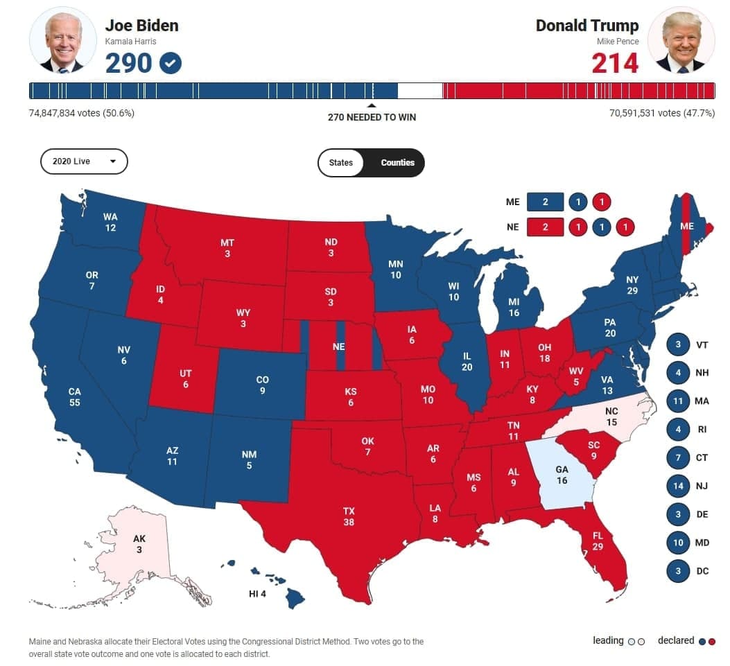 به گزارش پایگاه خبری رسا نشر – دقایقی قبل با مشخص شدن نتیجه شمارش آرا در ایالت های باقیمانده امریکا جو بایدن توانست ۲۹۰ رأی الکتورال را به دست آورد و دونالد ترامپ رئیس جمهور فعلی آمریکا را شکست دهد.