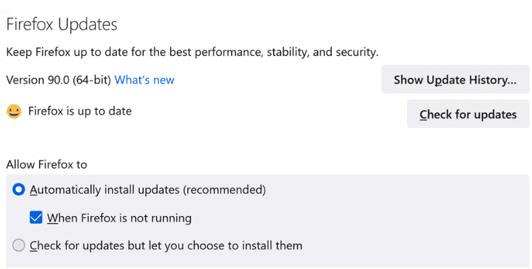 برای به روزرسانی به جدیدترین نسخه ، برنامه موزیلا فایرفاکس را باز کنید و به تنظیمات> عمومی> به روز رسانی فایرفاکس> بررسی برای به روزرسانی ها بروید. فایرفاکس همچنین در حال ارائه نسخه ۹۰ به روزرسانی برای اندروید است که می توانید آن را از فروشگاه گوگل پلی دریافت کنید.