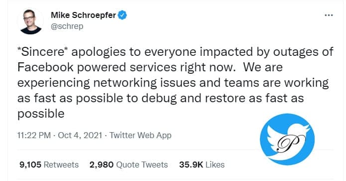 مایک شروپفر، مدیر ارشد فنی فیس بوک، در توئیت خود از مشکلات شبکهای گفته و قول داد تا تیمهای فنی در سریعترین زمان ممکن رفع اشکال کرده و سیستمها را بازیابی کنند.